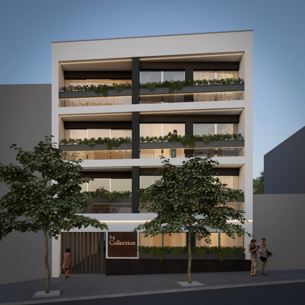 O projeto 24Collection consiste na construção de dois prédios urbanos, ambos com superfície coberta, um com uma casa de r/chão e quintal e outro com uma casa de 2 pisos e logradouro. Trata-se de dois edifícios antigos em situação de encosto com as edificações vizinhas (em banda) e à face do passeio público.