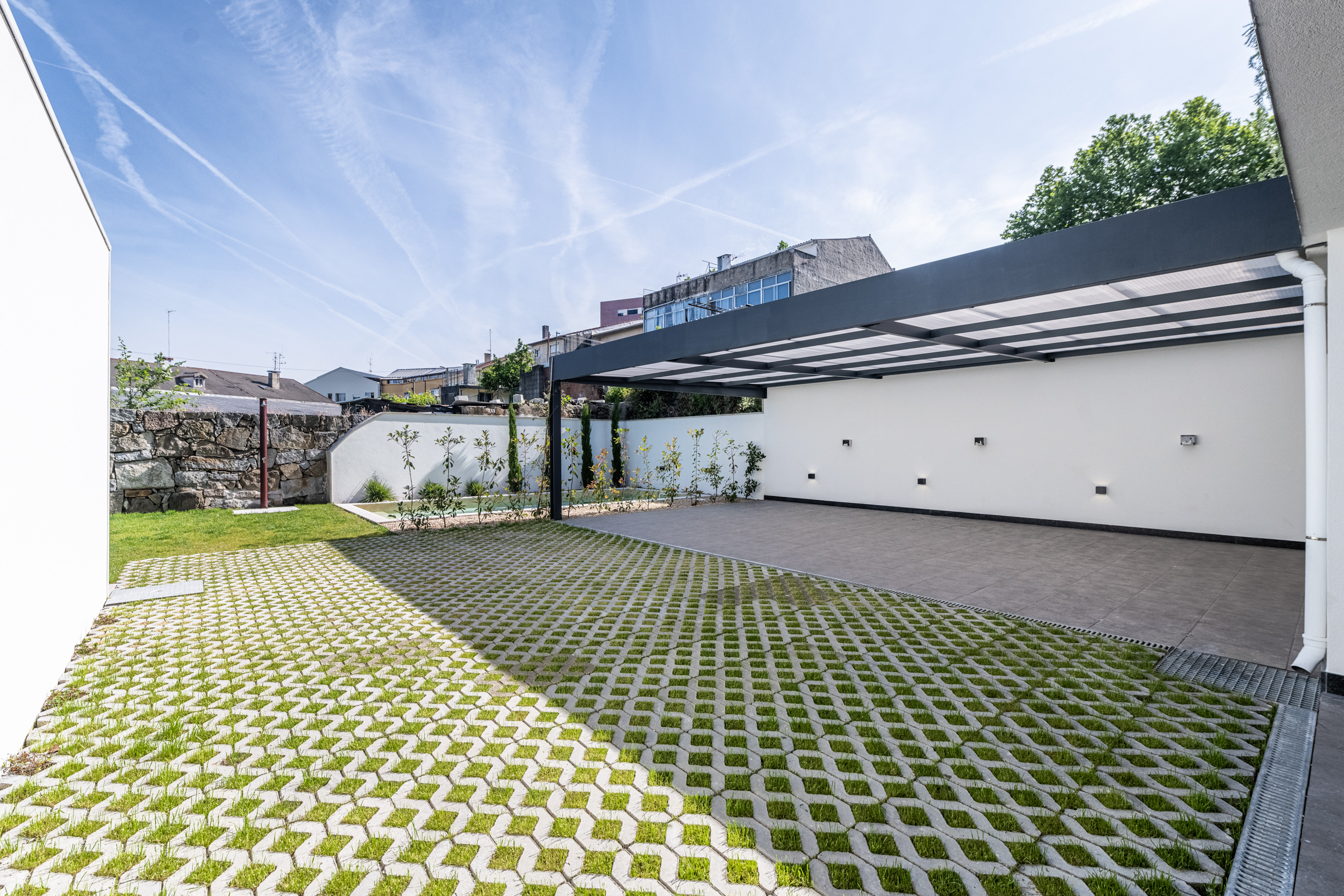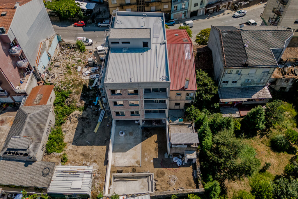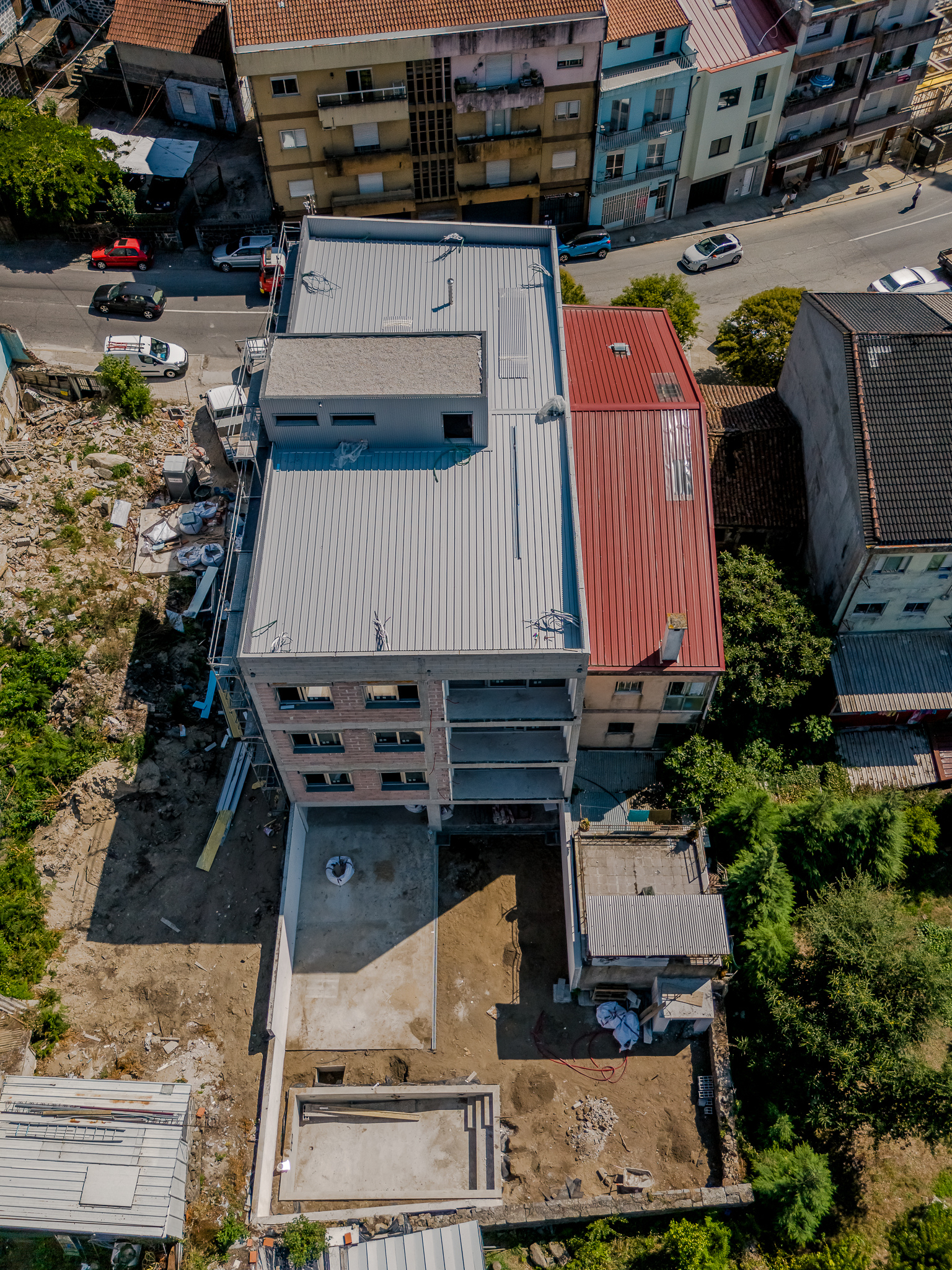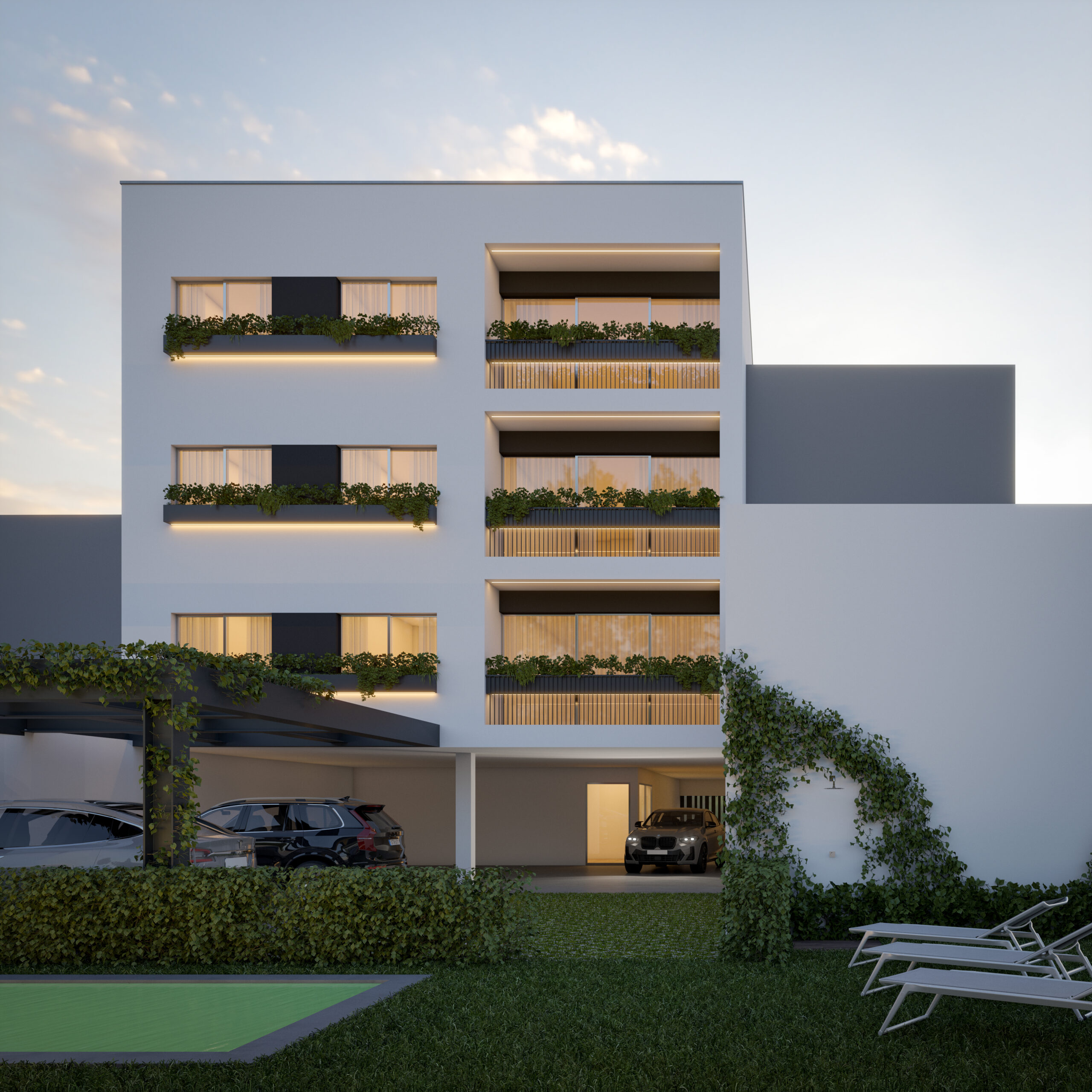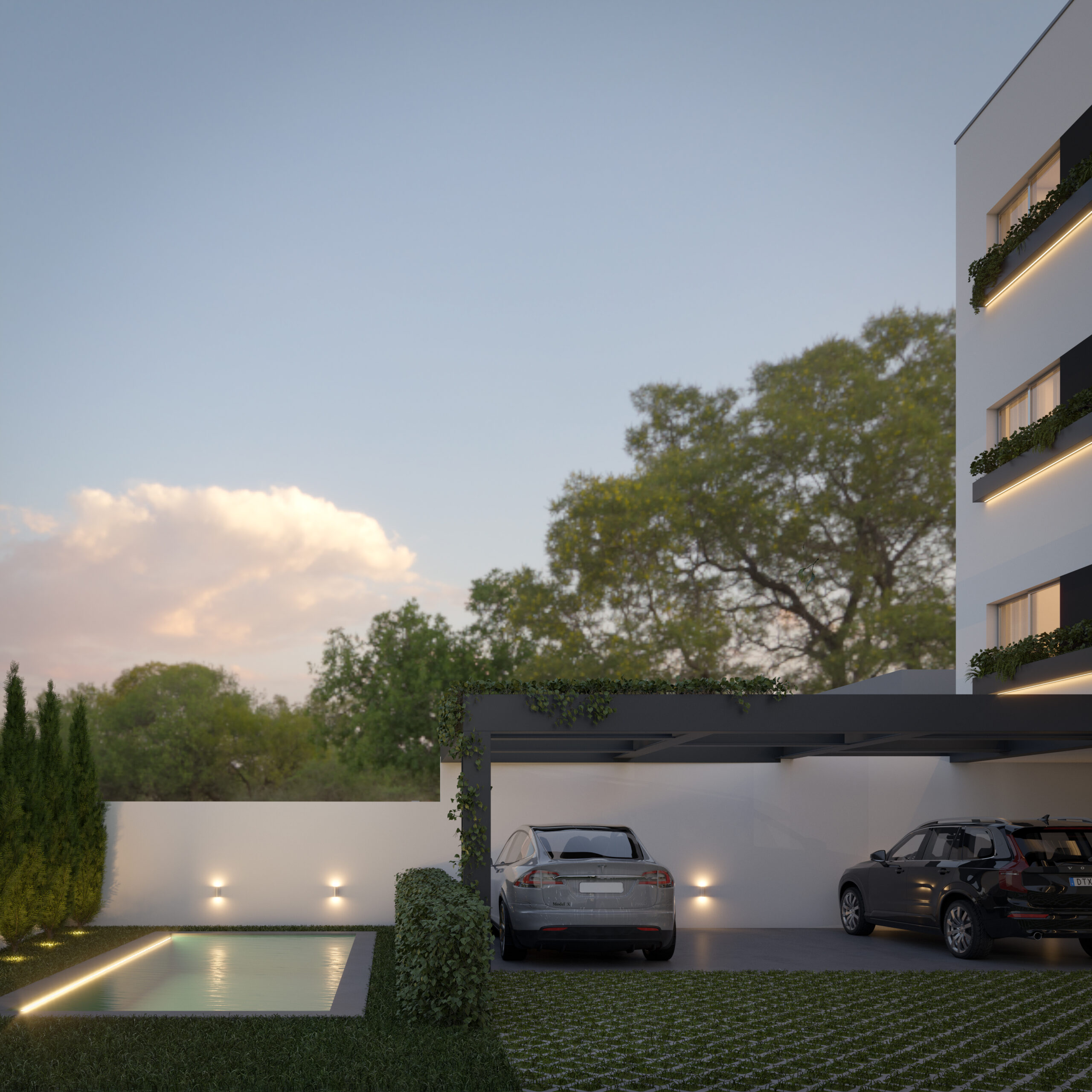 O edifício será composto por 4 pisos (r/chão mais 3 andares). O r/chão terá a entrada principal do edifício composta por uma porta para peões e um portão para automóveis. As entradas darão acesso a um espaço de acesso comum, que por sua vez liga ao logradouro de solo permeável, e as zonas de acesso às habitações. Ainda no r/chão, estão previstos 7 lugares de estacionamento privados e um apartamento do tipo T1. Nos andares superiores, estão previstos dois apartamentos do tipo T2 por piso, ou seja, no total haverá 7 frações de habitação, o que permite obter a área suficiente no r/chão (dentro do r/chão e no coberto/pala que se prolonga na parte posterior) para a colocação de 7 lugares de estacionamento privados cobertos, ou seja, 1 lugar por fogo (mínimo exigidos).